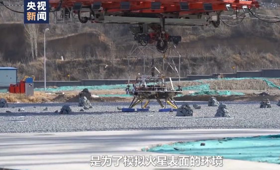 为了模拟火星表面的环境,在现场地面上铺设了特殊材料形成坑或者坡的形状,同时建设了一套塔柱高140米,形成内圈直径120米的设施,来模拟探测器在火星重力环境下的着陆。