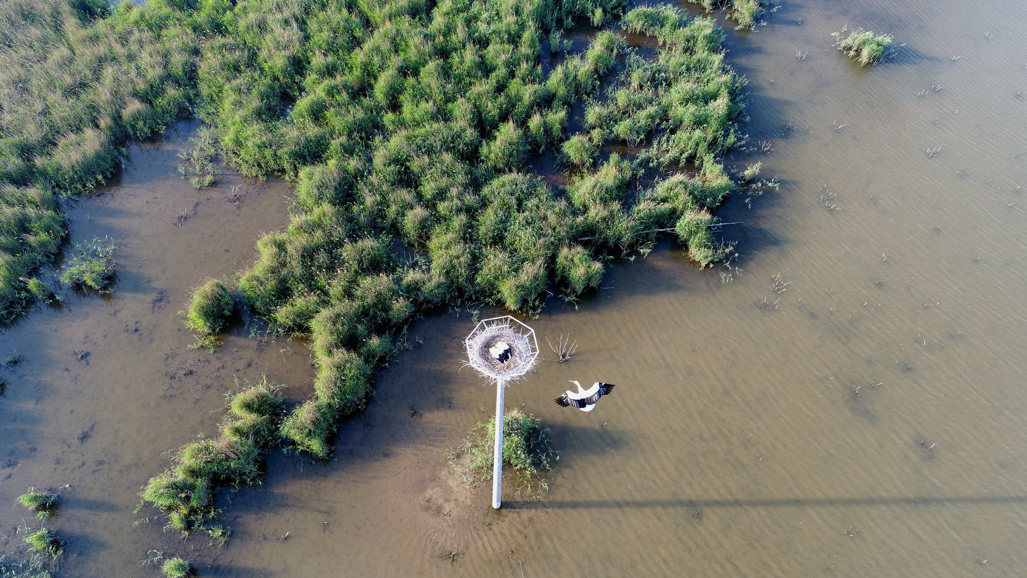 淡水河流湿地 充裕的淡水使盐碱水不再向上渗出,植物生存环境持续改善。紧接着,2021年以来保护区陆续实施了17个湿地修复与生物多样性保护项目,恢复盐地碱蓬、海草床等本土植物5.2万亩,修复湿地超过30万亩。 光板地长出了盐地碱蓬,长出了芦苇,长出柽柳。“生态环境好不好,鸟儿最知道”。越来越多的鸟儿“用翅膀投票”,在这里越冬、建巢、繁衍。目前,保护区的鸟类数量已经从设立初期的187种增加到373种。 留得住,更要护得好 乘坐电瓶车穿梭在芦苇荡中,不时有白鹭、鸿雁等鸟儿掠过。远处的电线杆上,几乎每根杆子头上都立着一只大鸟。 保护区工作人员崔宁兴奋地告诉记者:“你看这个就是东方白鹳!这个电线杆上也有,离我们非常近。” 东方白鹳是我国一级重点保护野生动物,也是保护区候鸟迁徙的标志性鸟类,每年都有2000多只从俄罗斯远东和我国东北地区来到这里。大部分在此,随后继续往南,飞往长江中下游的沼泽湖泊,剩下的就留在这里越冬。 眼下,越来越多的东方白鹳相中了保护区的环境,扎根在此,成为留鸟。