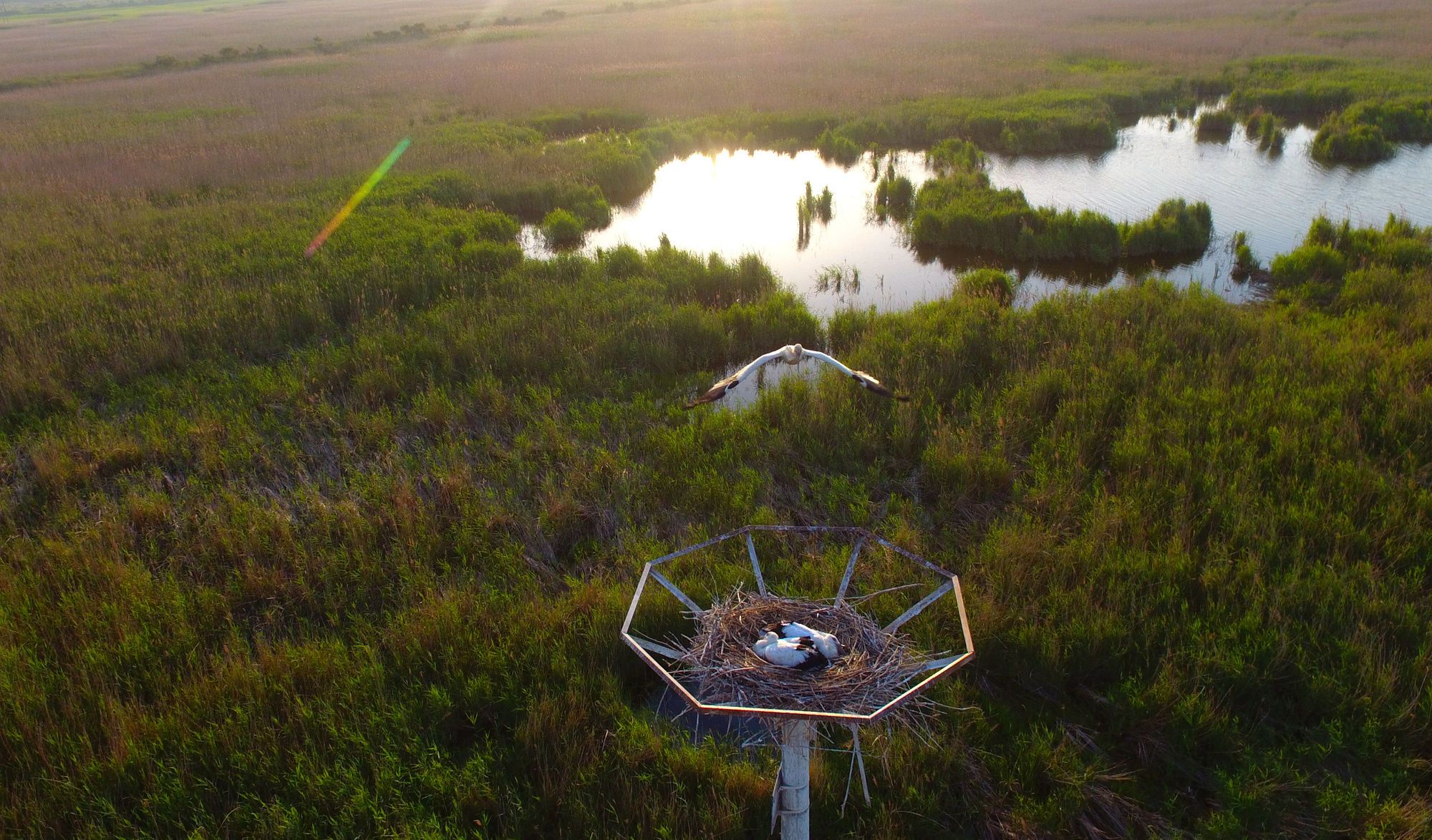 工作人员与候鸟 周立城:东方白鹳的生活习性是在高大的乔木上安家落户,为了给它保障安全,我们建了大约130多根人工招引巢,用水泥杆或者金属杆建了一个10米左右的简易的巢穴,我们俗称“毛坯房”。还是让东方白鹳靠自己的力量用这些树枝、树叶、柳絮、棉花,做一个精装。我们对它是爱,不是溺爱。