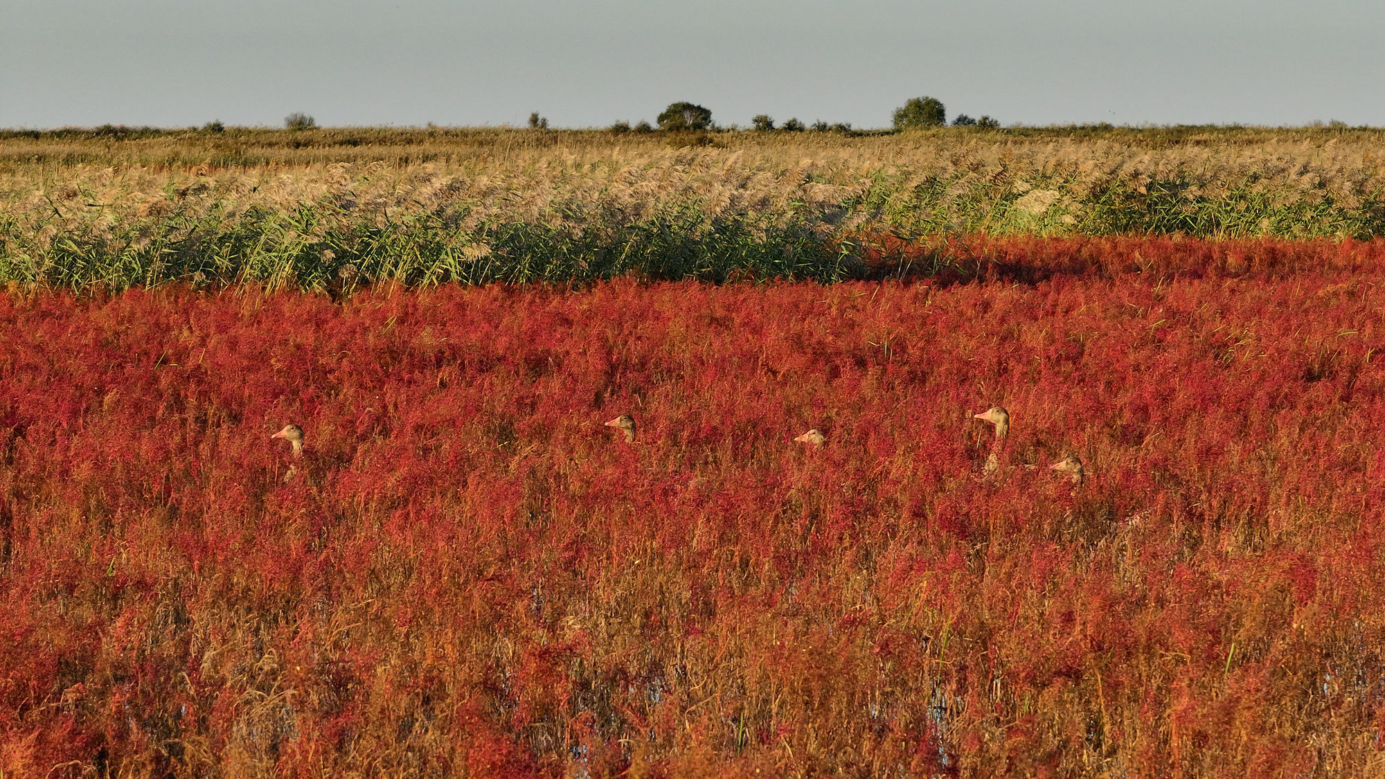 山东黄河三角洲自然保护区 黄河三角洲能有多少鸟?聊起这个问题,保护区管委会负责监测鸟类的工程师张希涛,能来一段相声“贯口”。 张希涛:首先来的一般是鹤类和雁鸭类。丹顶鹤、蓑羽鹤、白头鹤、白枕鹤、沙丘鹤等这一系列鹤都要来。再一个雁鸭类的,像野鸭在我们这里就接近30种:斑嘴鸭、绿头鸭、秋沙鸭、白头鸭、赤麻鸭等一系列鸭。鸟浪最厉害的时候能达到一两公里,非常壮观。