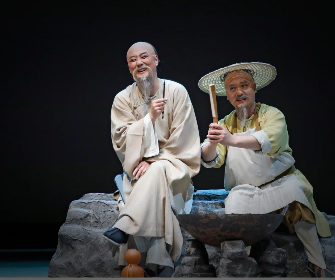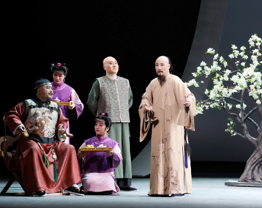 李政成的精湛表演则使创作完美闭环。在描绘郑板桥绘画菊花与兰花的情景时,他巧妙地采用了文戏武唱的手法,别具匠心地展现了郑板桥的才华与骨气。而在剧终部分,长达十多分钟、包含56个核心唱段的唱腔如波浪般层层推进,将郑板桥一生的感悟推至观众心底。舞台上的清冷视觉效果与演员炽热的情感表达形成了鲜明的对比,在戏剧的张力中,一个有温度、有深度、有情怀的郑板桥仿佛从历史中走来,真正“活”了起来。