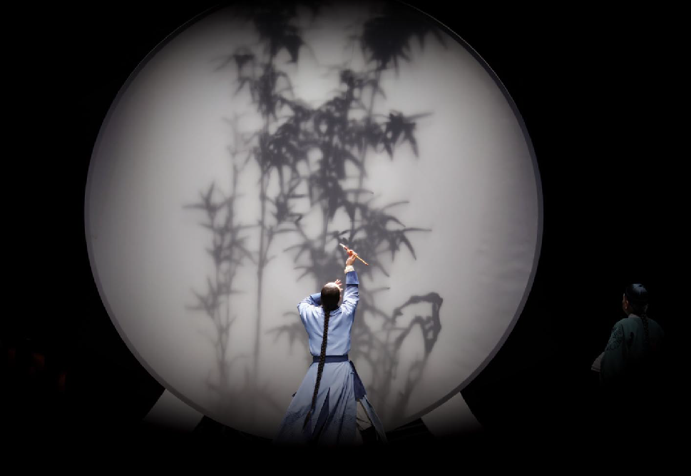 舞台上,古琴与琵琶的悠扬旋律仿若一阵清风,轻轻拂开历史的画卷,清代扬州的风情万种如诗如画般徐徐展开。郑板桥笔下的竹、兰、石化作他性格的三种特质,生动地展现了为官之德、书生之质、为民之心,以及他对生命价值的执着坚守,深深地震撼着每一位观者的心灵,让他们沉浸其中,心潮澎湃。