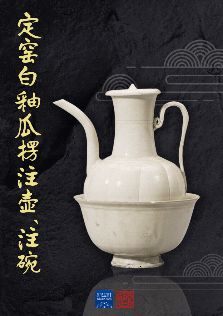 这是收藏在大同市博物馆的定窑白釉瓜楞注壶、注碗。注壶通体施白釉,壶口微敞,长弧颈,曲流,矮圈足。注碗口沿外撇,作六出花瓣形。王利霞介绍,古人在注碗中放入热水,然后将盛酒的注壶放置于碗中加热,待到合适温度取出饮用。