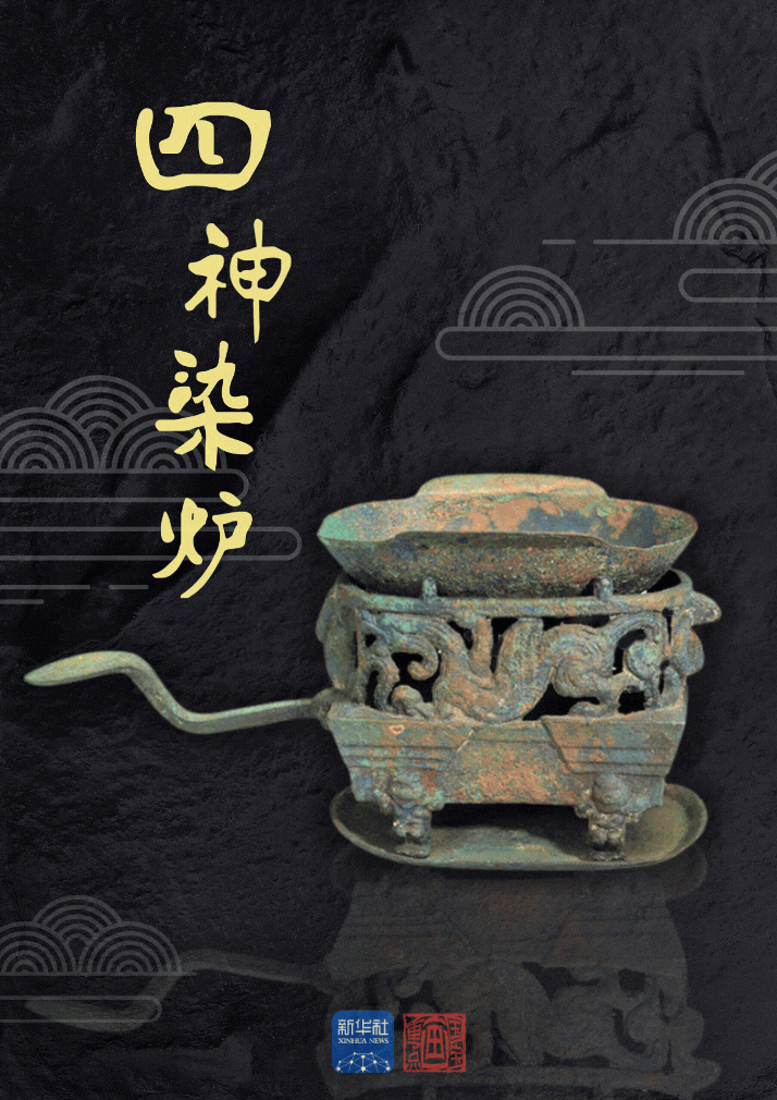 这件小巧的器具名为四神染炉,是一种饮食器,构造分为三部分。炉体呈椭圆形,下面有四个人形立足于承盘内。