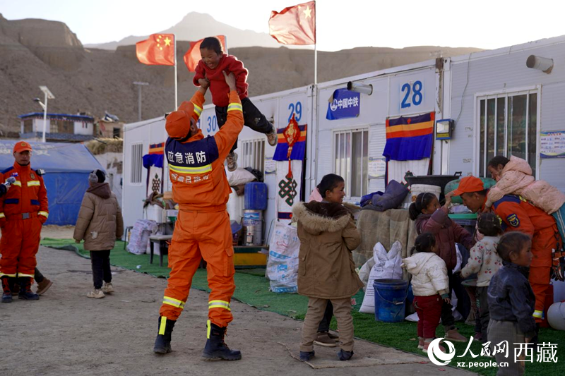 热木青村安置点,消防员们同孩子们嬉戏玩耍。人民网记者 次仁罗布摄 西藏日喀则市定日县长所乡森嘎村安置点,拉姆、旦增顿旦母子正在吃“古突”粥。一位身着橙色制服的“客人”突然走了进来,他是定日县消防救援大队米玛扎西。 “我在咱们村做消防检查,知道你们在这个板房,就带了糌粑和砖茶来看看!”米玛扎西说。 经历了地震,米玛扎西和这对母子已经成了最熟悉的朋友。地震发生后,他第一时间冲入灾区,在废墟中将他们救了出来。 从那时候起,拉姆母子就和米玛扎西熟络了起来——遇到困难,他们总能想起这位救命恩人,而米玛扎西也经常来看望他们,关心他们是否在生活上遇到了困难。 “突及其(藏语意为‘感谢’)!今天,咱们坐下一起吃!”拉着米玛扎西,拉姆热情地邀请。她打开锅子,为米玛扎西盛上了满满一碗。 他们围坐着,聊着,半个小时很快就过去,米玛扎西起身作别离开,开始继续今天的巡检工作。 “他对我们啊,那可真没的说。今天,请他喝上一碗‘古突’粥,他就是我们不可分割的家人。”拉姆说。