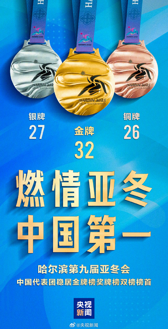 中国体育代表团收获32金、27银、26铜共计85枚奖牌,位列本届亚冬会金牌榜和奖牌榜首位,创造亚冬会历史参赛最好成绩。