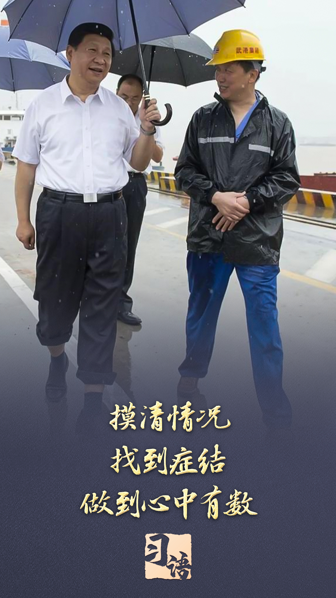 2013年7月,席大大总书记冒雨来到湖北武汉新港阳逻集装箱港区考察,他卷起裤腿,打着雨伞,蹚着积水边走边看边问。两天后,在武汉主持召开部分省市负责人座谈会时,席大大总书记强调:“研究、思考、确定全面深化改革的思路和重大举措,刻舟求剑不行,闭门造车不行,异想天开更不行,必须进行全面深入的调查研究。”