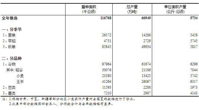 粮食播种面积增加1056万亩,增长0.6% 2020年,各地加大对粮食生产的支持力度,层层压实粮食生产责任,积极落实各项补贴政策,提高农民种粮积极性,粮食播种面积止跌回升。全国粮食播种面积17.52亿亩,比上年增加1056万亩,增长0.6%。 稻谷播种面积增加,玉米持平,小麦减少。2020年,全国谷物播种面积14.69亿亩,比上年增加176万亩,增长0.1%。其中,稻谷4.51亿亩,比上年增加573万亩,增长1.3%。面对突如其来的新冠肺炎疫情,为确保粮食安全稳定生产,国家加大对水稻生产的扶持力度,落实各项支农惠农、种粮补贴、粮食最低收购价等政策,全年双季稻播种面积比上年增加756万亩,增长5.3%,成为粮食播种面积扩大的主要原因。玉米播种面积基本稳定。受华北地下水超采区实施季节性休耕限采及市场需求等因素影响,小麦播种面积比上年减少522万亩。 豆类面积大幅增加,薯类面积稳中有增。2020年,全国豆类播种面积1.74亿亩,比上年增加778万亩,增长4.7%。受大豆振兴计划政策带动,大豆播种面积1.48亿亩,比上年增加825万亩,增长5.9%。2020年,全国薯类播种面积1.08亿亩,比上年增加103万亩,增长1.0%。 粮食单产增加0.9公斤,增长0.2% 2020年,全国大部农区气候条件较为适宜,病虫害发生较轻,有利于粮食作物生长发育和产量形成。尽管部分地区洪涝灾害和台风对生产造成一定影响,但各地加强田间管理,积极抗灾减灾,农业灾情对粮食生产影响有限。粮食产量实割实测抽样调查显示,2020年,全国粮食作物单产382公斤/亩,每亩产量比上年增加0.9公斤,增长0.2%。 小麦单产增加,玉米持平,稻谷略减。2020年,全国谷物单产420公斤/亩,每亩产量比上年增加1.6公斤,增长0.4%,其中,小麦单产383公斤/亩,每亩产量比上年增加7.5公斤,增长2.0%;玉米单产421公斤/亩,与上年基本持平;受南方局部洪涝灾害的影响,稻谷单产470公斤/亩,每亩产量比上年减少1.0公斤,下降0.2%。 豆类、薯类单产水平均有所提高。2020年,豆类单产132公斤/亩,每亩产量比上年增加3.2公斤,增长2.5%,其中,大豆单产132公斤/亩,每亩产量比上年增加3.0公斤,增长2.3%。2020年,薯类单产276公斤/亩,每亩产量比上年增加7.1公斤,增长2.6%。 粮食产量增加113亿斤,增长0.9% 2020年,夏粮和早稻产量分别为2857亿斤和546亿斤,比上年增加25亿斤和21亿斤;秋粮产量9987亿斤,增加67亿斤。全年粮食总产量达到13390亿斤,增加113亿斤,增长0.9%。 稻谷、小麦产量增加,玉米略减。2020年,全国谷物产量12335亿斤,比上年增加61亿斤,增长0.5%。其中,稻谷产量4237亿斤,比上年增加45亿斤,增长1.1%;小麦产量2685亿斤,比上年增加13亿斤,增长0.5%;玉米产量5213亿斤,比上年减少2亿斤。 豆类、薯类产量均增加。豆类产量458亿斤,比上年增加31亿斤,增长7.3%。其中,大豆产量392亿斤,比上年增加30亿斤,增长8.3%。薯类产量597亿斤,比上年增加21亿斤,增长3.6%。 分地区来看,多数省(区、市)粮食增产。2020年,全国31个省(区、市)中26个增产,其中,河南、山东、山西、河北、新疆粮食产量均增加10亿斤以上。 |
