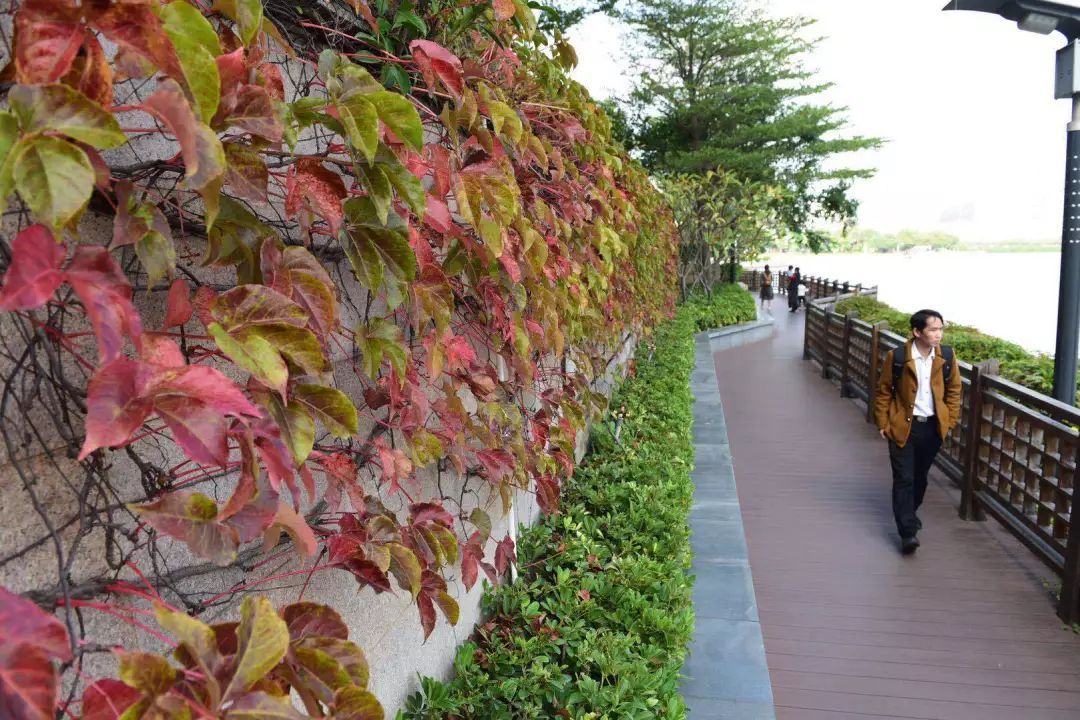 旅途 摄 彩 爬山虎 赏花点:筼筜湖步道 在筼筜湖步道靠近湖中桥一侧的木栈桥上,有一处墙体上种满了爬山虎,在其他季节里,这里是满墙绿色。