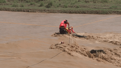 救援人员在救被困河中的夫妇时,