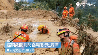 消防员在救援途中经过一个塌方造成的泥潭,