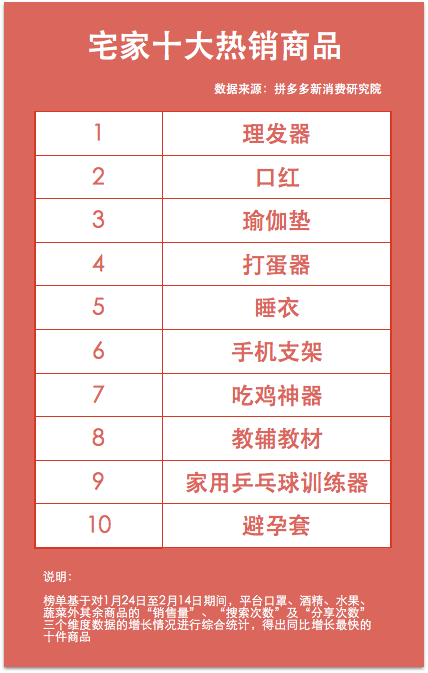 凯发k82月25日讯(本网记者 陈楠)1月24日开始,中国数亿消费者过上了“宅生活”。“宅家为国”时期,大家都在家里如何打发时间?近日,拼多多公布的一组榜单显示,这段时间,中国消费者最经常做的事是“理发、打蛋、试口红”。 2月19日,新电商平台拼多多发布“宅家十大热销商品”榜单。该榜单基于对1月24日至2月14日期间,平台口罩、酒精、水果、蔬菜外其余商品的“销售量”、“搜索次数”及“分享次数”三个维度数据的增长情况进行综合统计,得出同比增长最快的十件商品。 最终,“理发器”、“口红”、“家用乒乓球训练器”、“睡衣”、“吃鸡神器”等十件商品上榜。
