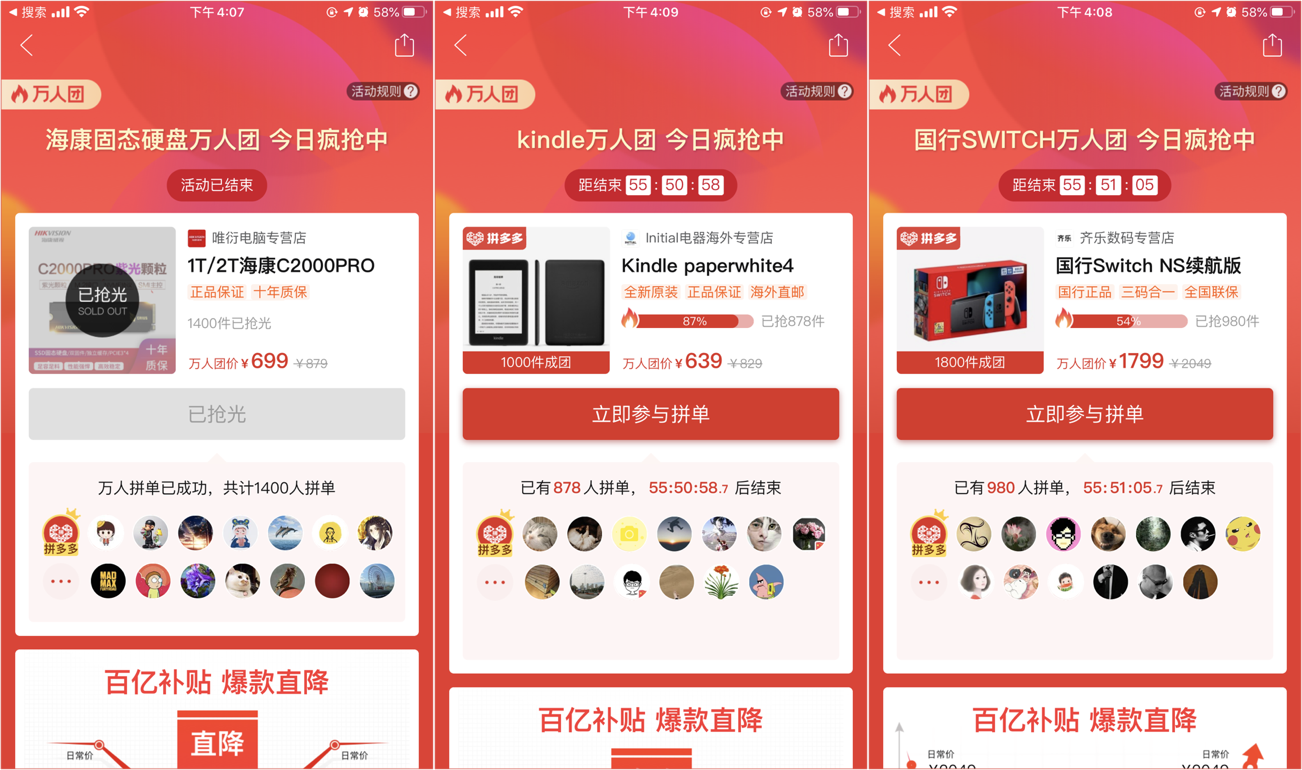 ▲多款品牌热门商品登陆拼多多万人团,其中海康威视固态硬盘的数码产品午夜十二点上线万人团后,10秒钟内即被超额抢购 “百亿补贴”是拼多多于2019年6月上线的常设性购物补贴产品,迄今为止,已经连续补贴超过200天,创造了电商行业的新纪录,2019年,拼多多百亿补贴入口售出了超过200万台苹果手机。 此前,有媒体报道显示,拼多多平台的百亿补贴入口活跃用户数已经超过1亿,平均每天有数千万人通过“百亿补贴”入口挑选包括苹果手机、海蓝之谜在内的大牌商品,据媒体按照客流量测算,相当于142家北京SKP商场连续搞了近300天店庆活动,和1312座“常年全场七折”的中关村电脑城。 宗辉表示,“百亿补贴节”是对百亿补贴活动的一次加码升级,旨在通过更大力度的补贴促销,以适应消费者过去一个月无法满足的消费需求,在复工期到来时,第一时间享受全品类品牌商品的折扣。 |