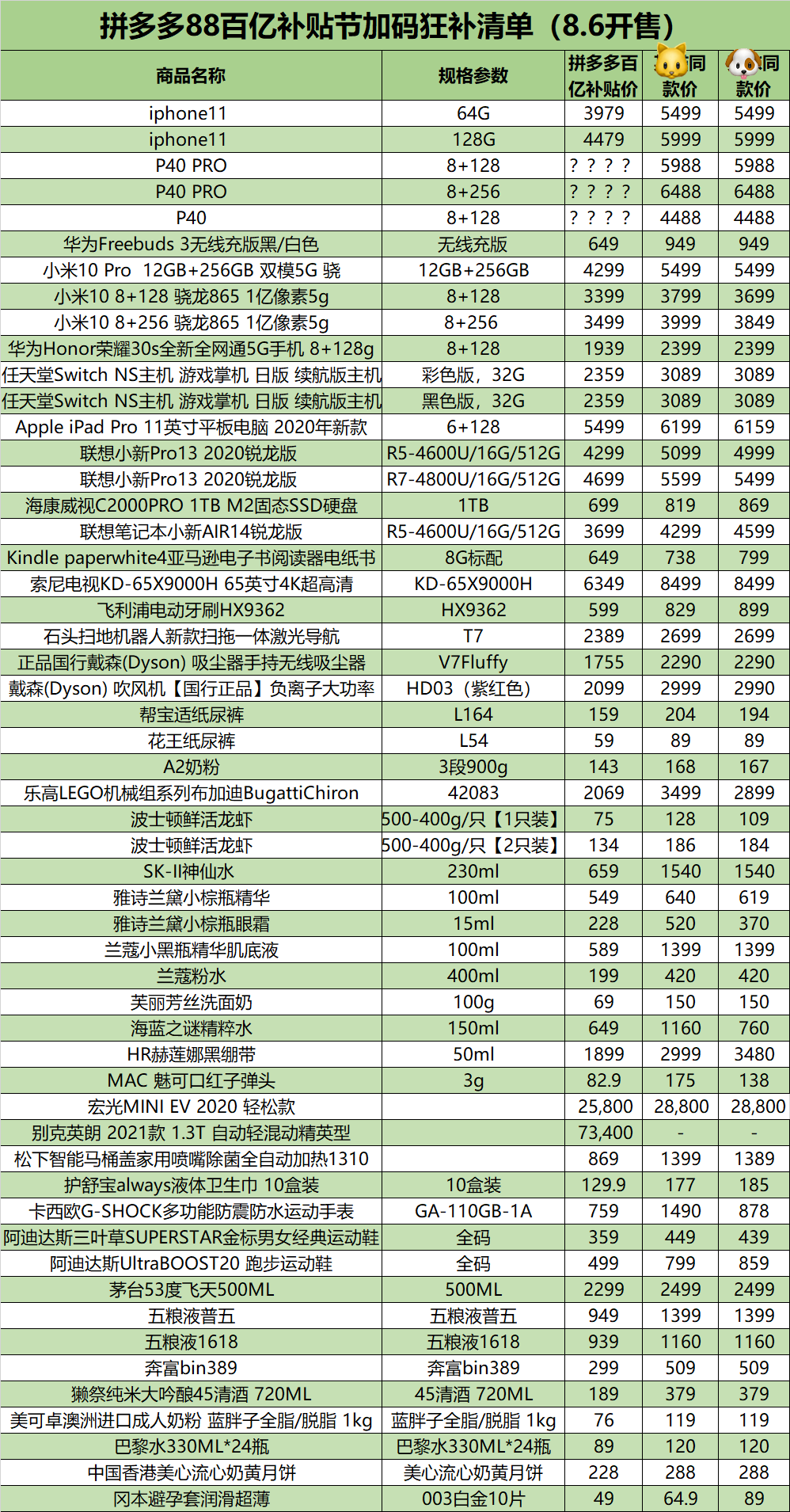 拼多多“百亿补贴节”公布的部分价格清单显示,平台包括iPhone 11、任天堂Switch、SK-II神仙水、花王纸尿裤等在内热门商品售价均大幅低于其他渠道销售价格。 8月5日,新电商平台拼多多宣布,为进一步满足消费者对高品质产品与服务的需求,持续释放内需市场的潜力,助力形成以国内大循环为主体的新发展格局,平台将再次提高商品销售的补贴力度,在8月6日正式上线“百亿补贴节”活动。届时,众多大牌商品将以前所未有的优惠价格直接呈现在消费者面前。 据介绍,拼多多“百亿补贴节”将从8月6日开始,持续至8月8日。在为期三天的活动中,平台将加大对包括Apple苹果、Dyson戴森、Sony索尼、华为、雅诗兰黛、兰蔻、Mac魅可、花王、五粮液等在内的近期国内外热销品牌的补贴力度,覆盖家电数码、美妆个护、母婴亲子、食品饮料、服装箱包等近20个品类的上万款商品。 “此次活动,是我们贯彻让消费者‘每天都是618,每晚都过双11’理念的又一举措。”拼多多“百亿补贴”负责人宗辉说。此前,拼多多曾在传统节日和销售旺季之外,先后推出过“秒杀节”“真香节”“清凉节”等补贴让利活动,得到了大量消费者、品牌方和经销商的支持和肯定。 宗辉表示,活动期间,在平台的大力补贴下,不少大牌商品的价格将迎来“历史新低”。“iPhone 11 64G版将直接降至3979元,首次来到4000元以下区间;飞利浦电动牙刷HX9362仅售599元,不到600元即可拿下HX9系高端产品;230mL装的SK-II神仙水到手价仅为659元,均达到全渠道历史最低价。” 此外,对于消费者呼声最高的汽车类商品,拼多多也进行了积极响应。在平台公布的部分商品价格清单上,五菱宏光 MINI EV 2020轻松款补贴价为25800元,比官方指导价28800元优惠3000元,别克英朗2021款 1.3T 自动轻混动精英型轿车仅售73400元,比官方指导价125900元优惠40%以上。 “不少网友都把‘人民需要什么,拼多多就补贴什么’当作玩笑和段子,但我们是认真的。”宗辉表示,“拼多多将始终坚持以消费者为核心,不断提高商品补贴范围和力度,提升服务质量,让消费者每天都能花得更少、买得更好。” |