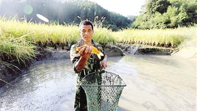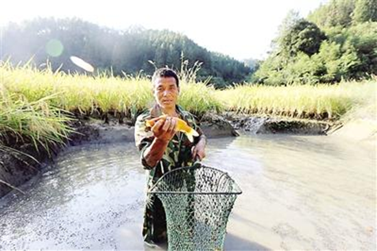 在松溪县旧县乡东厝村西坑底的山谷里,路口略显狭窄,往里走,山谷逐渐宽敞,鱼沟或呈“十”字、或呈“井”字有序排列。“稻花香鱼儿肥。”8月19日上午,旧县乡稻花鱼养殖专业合作社理事长刘尚西对记者说,2013年,合作社将村里200多亩荒废的山垄田整改成稻田,开挖鱼沟、鱼塘,种上优质水稻,引进瓯江彩鲤等稻花鱼品种,依托“合作社+农户”的模式走品牌化经营的路子。目前,合作社流转土地达一千余亩,其中,东厝村李香华、蔡富康、蔡朝清等六户贫困户以一百余亩土地和每户五万元扶贫小额贷款资金的方式入股合作社。