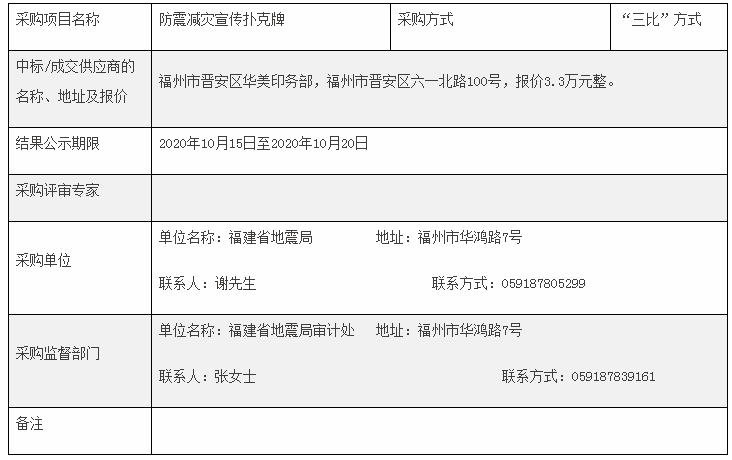 震害防御处防震减灾宣传扑克牌“采购结果公告”