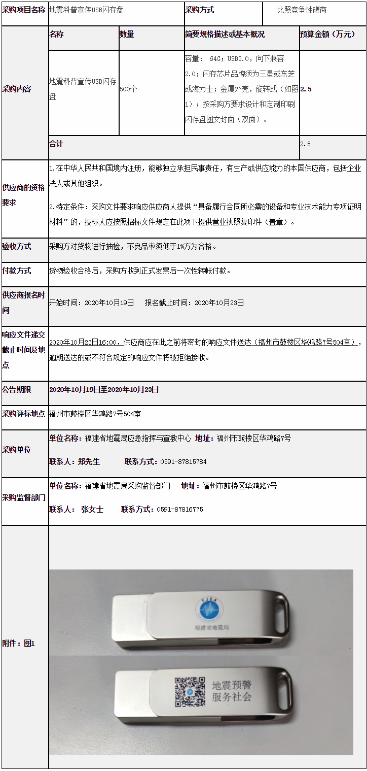 为做好地震科普宣传推广,福建省地震局应急指挥与宣教中心拟采购一批USB闪存盘,作为地震科普视频的存储发行载体,依据相关采购要求进行比照竞争性磋商采购,欢迎有意向、合格的供应商前来参加,现公告如下。