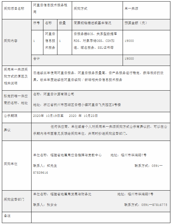 应急指挥与宣教中心阿里云信息技术服务单一来源采购公告