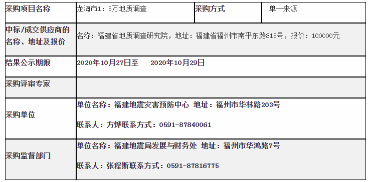 地震灾害预防中心龙海市1:5万地质调查采用单一来源采购结果公告