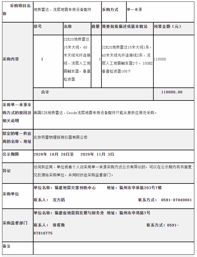 地震灾害预防中心“地质雷达、浅层地震专用设备配件”单一来源采购公示