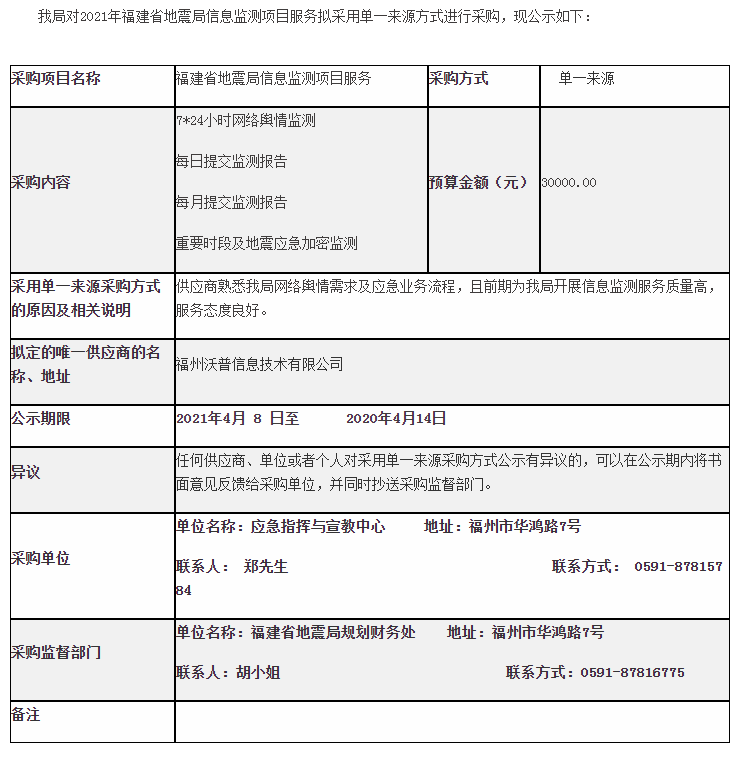 应急指挥与宣教中心福建省地震局信息监测项目服务采购公示