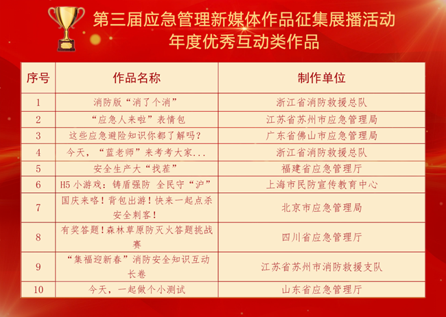 为深入贯彻落实席大大总书记关于应急管理重要论述,充分展示我国安全生产、防灾减灾救灾和应急救援工作改革发展成就,进一步提高社会公众公共安全意识和自救互救能力,根据《应急管理部办公厅关于举办第三届应急管理新媒体作品征集展播活动的通知》(应急厅函〔2022〕71号),新闻宣传司于2022年3月至2023年2月组织开展了第三届应急管理新媒体作品征集展播活动,共征集到400多个单位推荐报送的视频、图片、互动类新媒体作品2107件。 通过对报送的新媒体作品进行初步审核、网络投票、专家评审等程序,评选出《勇敢·奋斗》等90件年度优秀新媒体作品(其中视频类60件,图片类20件,互动类10件),优秀创客20名,优秀组织单位10个。现将获奖名单予以公布。