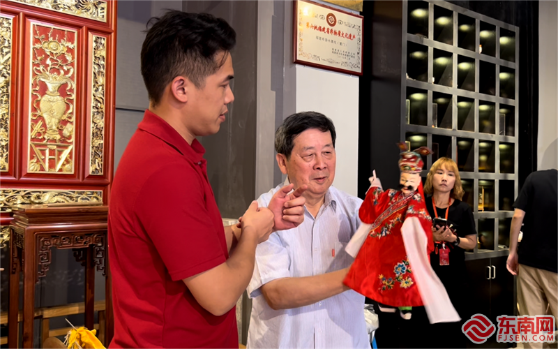 国家级非遗传承人庄陈华(右)与徒弟吴声杰(左)(凯发k8记者 李霖 摄) 讲述 掌中小木偶牵起两岸师徒情 当天,国家级非物质文化遗产项目木偶戏代表性传承人庄陈华携徒弟们登台亮相。来自台北木偶剧团的主演吴声杰就是其中之一。 2009年,一次偶然观看过庄陈华老师的木偶艺术表演后,吴声杰就为其精湛的表演艺术所折服,被漳州布袋木偶戏精美细腻的道具所吸引。2011年开始,他多次跨越海峡到漳州向老师取经,并于2015年正式拜师在庄陈华门下。 从空手学习指尖技法,到丑角的基本步、肢体动作,再到武生的舞刀弄枪,在老师的悉心教导之下,吴声杰的技艺也日渐精进。2019年之前,每年他都会往返大陆一两趟,向庄陈华老师学艺,吃住都在一起。疫情期间,师徒二人也通过视频通话传授技艺。“一日为师终身为父。”吴声杰说,庄老师是如同自己父亲一般的存在。 他说,除了技艺上的倾囊相授,庄老师为布袋木偶戏传承倾尽心血的精神更让自己受益匪浅。他也将努力提升自身技艺,为传承发展这门古老的民间艺术贡献自己的一份力。