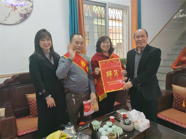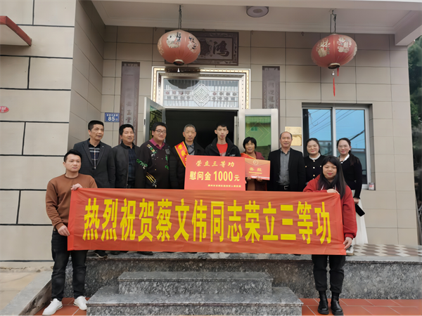 慰问组与蔡文伟及军属合影 军地领导与军属深入交谈,唠家常,了解生活近况,对他们一如既往关心支持国防事业表达崇高敬意和衷心感谢。春风化雨,润物无声。通过送喜报和春联、年画慰问军属等活动,切实提升军人地位,增强军属荣誉感,激发子弟兵投身国防,建功军营的热情。 |