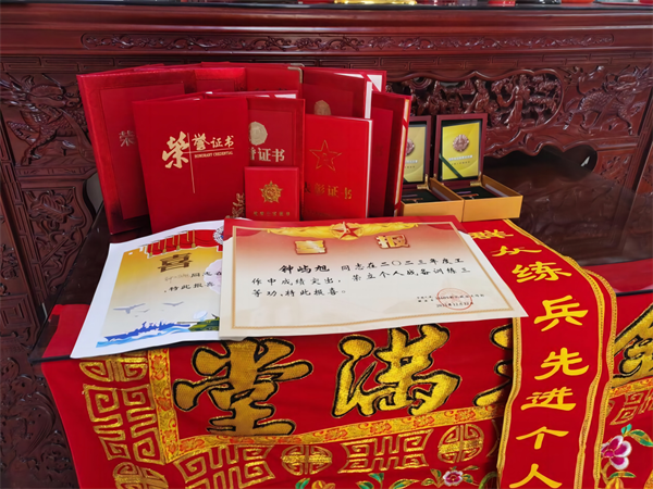 现役军人钟屿旭获奖奖章 横幅醒目、锣鼓震天、鞭炮齐鸣,区镇村退役军人服务保障体系三级联动,军地领导为军属戴上“军属光荣”绶带,营造浓厚的氛围,沿途群众争相围观,为节日增添了光彩。 尊崇有实度,喜报有温度。一张喜报连着军心士气,系着军属荣光,承载着军人家庭的荣耀,全社会的尊崇。