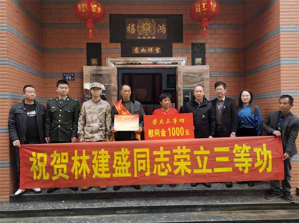 喜报频传桑梓地,荣耀常驻功臣门。1月30日-2月1日,龙海区退役军人事务局与区人武部联合开展“为立功军人送喜报”活动。先后为荣立三等功现役军人海澄镇钟屿旭、蔡文伟,紫泥镇林建盛,隆教乡杨跃聪家属送上立功喜报及慰问金,并带去春节的祝福和问候。