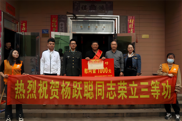 慰问组与杨跃聪军属合影 杨跃聪的父亲深切地表示,当初送儿参军,就是想通过部队的锤炼,成为一名顶天立地的男子汉,这份喜报就是对我们最大的安慰和褒奖。