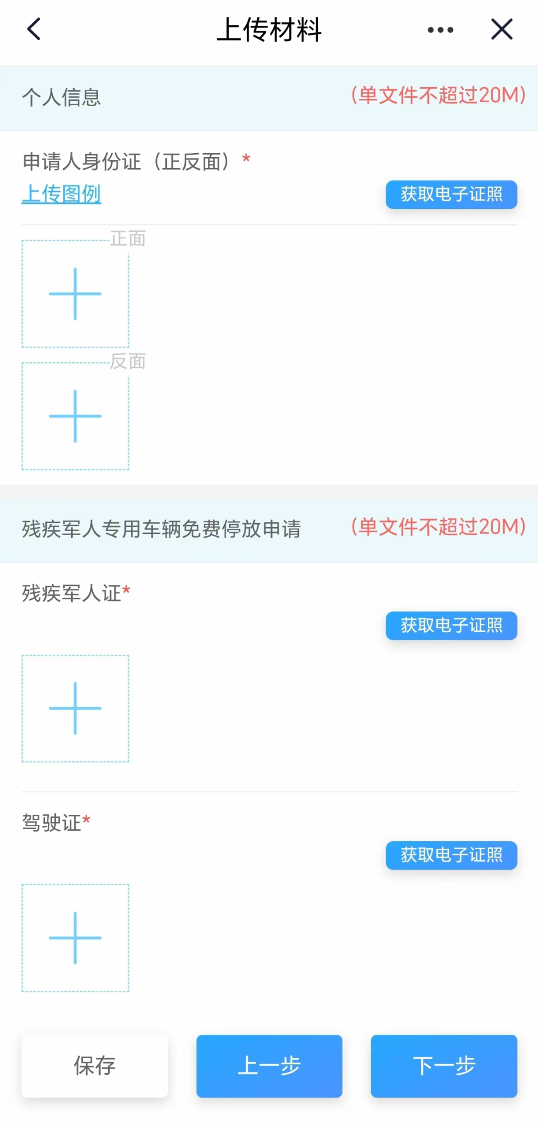 4.点击“+”拍照上传相关证件。(可通过“获取电子证照”直接获取证件信息)
