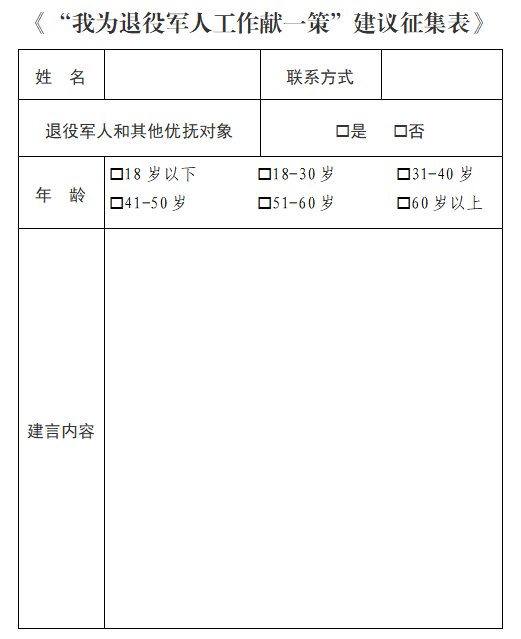 为科学谋划明年及“十五五”时期全省退役军人工作,更好服务经济社会发展,服务国防和军队建设,现面向社会各界开展“我为退役军人工作献一策”活动。诚邀广大关心和支持退役军人工作的各界人士积极参与。