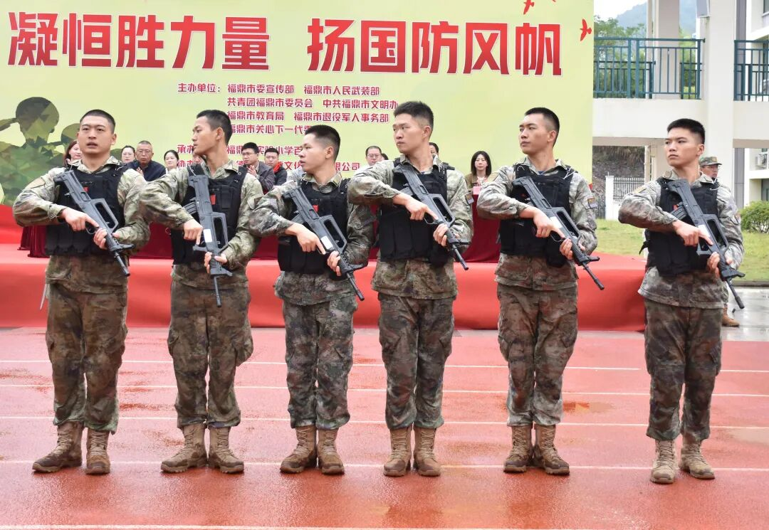 实小百胜校区校长董春风围绕“恒润品格、恒胜意志”办学理念,介绍军校成立背景及“国防教育润心+军事实践强能”目标,提及军校建设得到驻鼎部队大力支持,后续将联合开展军事训练、国防讲座等活动,以军地协作夯实双拥教育基础。 现场为“福鼎市少年军校”授牌后,校长为驻校教官颁发聘书,这些教官均由驻鼎部队精心选派,承载着军民共育的责任。教官迈正步授校旗,学员代表接旗后高举,全体学员行队礼致敬,军地同心的画面格外动人。校大队委陈飘楠带领学员宣誓,“热爱祖国、尊崇国防”的誓言响彻校园;某驻鼎部队官兵带来刚劲有力的军体拳表演,用军人风采点燃少年热情,更彰显军地双拥共建的深厚情谊。首批学员随后展示队列、拳术、枪术及旗语操、感恩手势操,动作整齐、气势昂扬,尽显“恒胜少年”在双拥氛围滋养下的精神风貌。